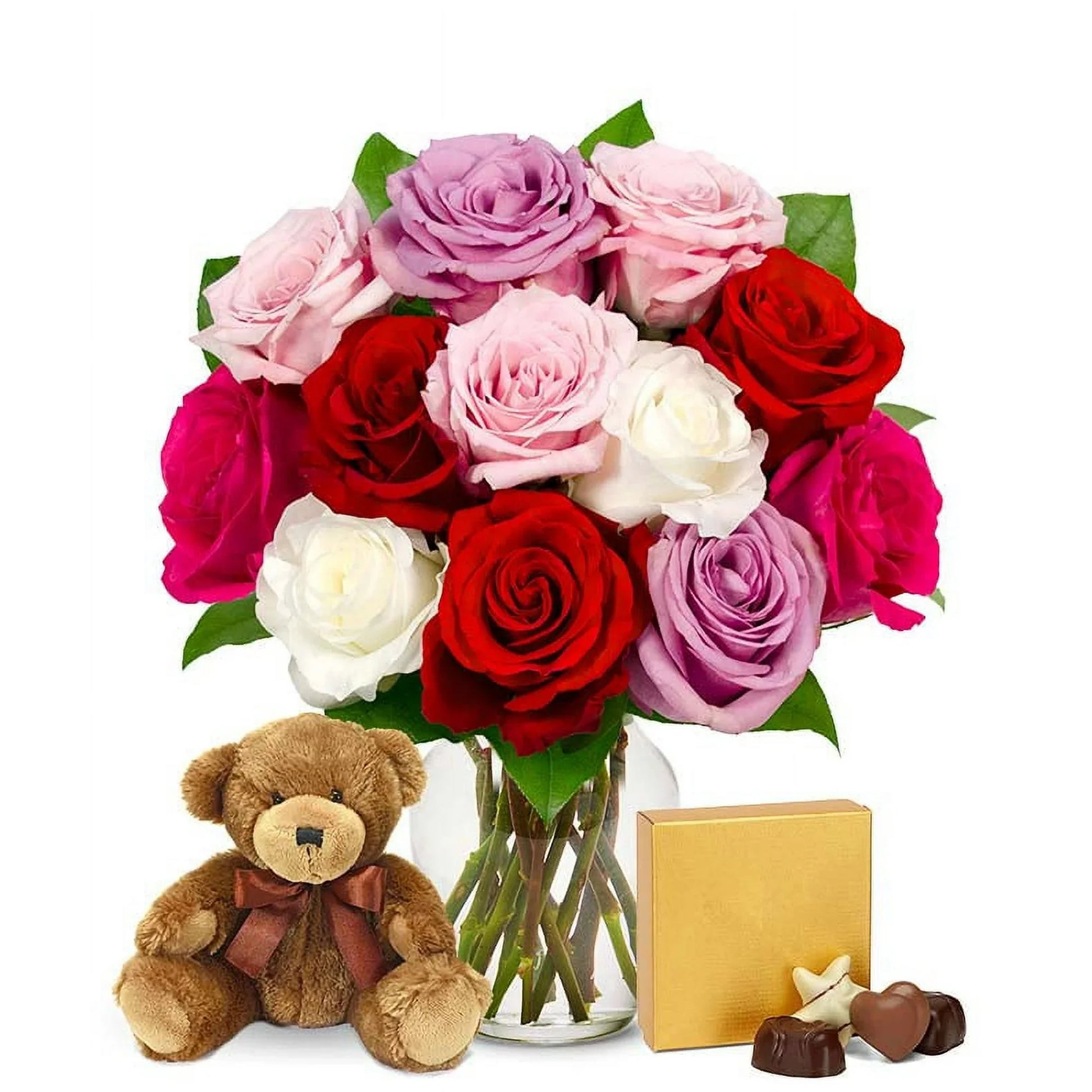 - Includes: 12 Roses in Various Colors (Red, Pink, Purple, White), Gourmet Chocolate, Stuffed Teddy Bear + Free Glass Vase