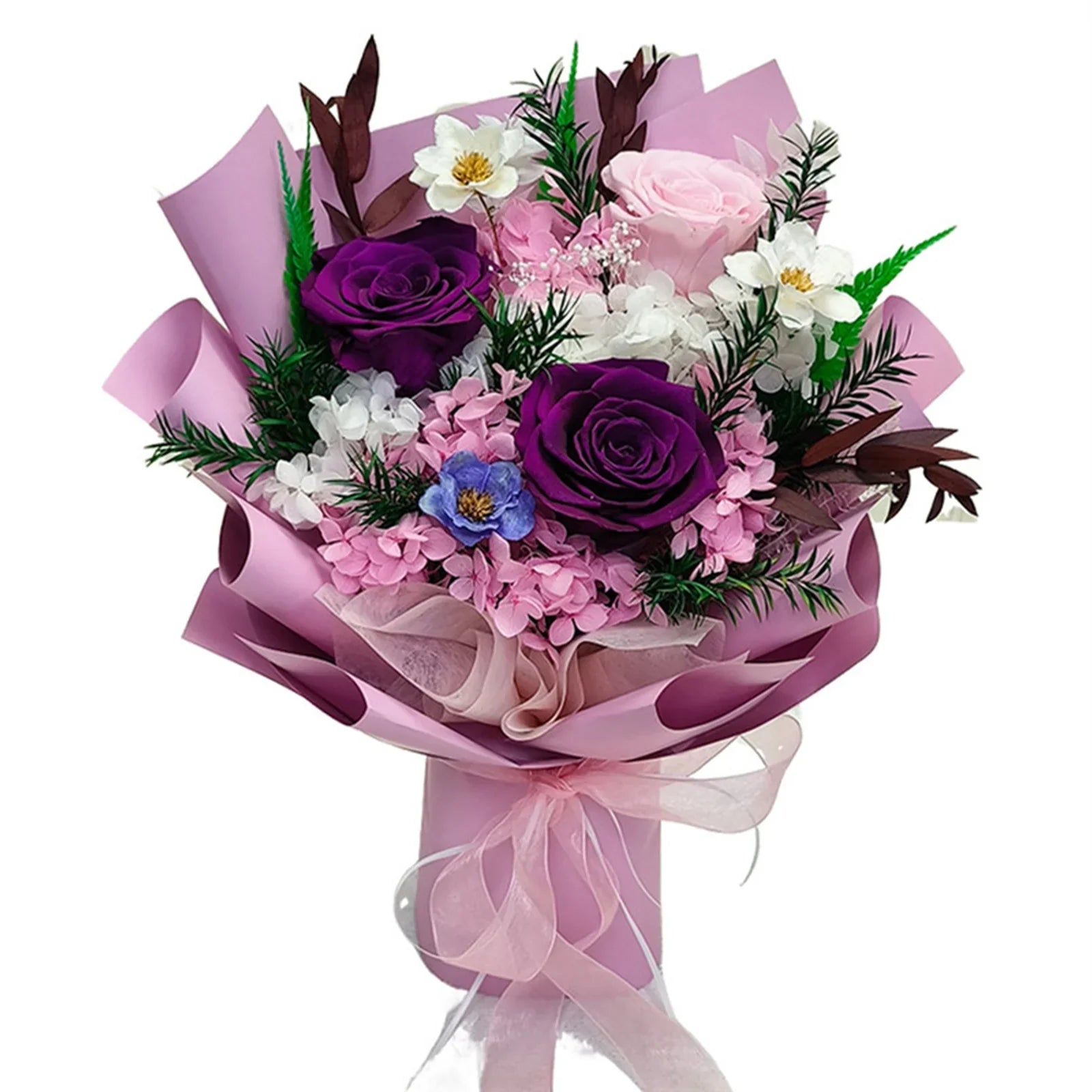- Handmade Bouquets: Designed by florists, the bouquets are handcrafted from Preserved Rose, Hydrangeas Gerbera Anandria , Field Pennycress Fern Leaves Ruscus Leaves Feather Dipsacus Sativus, etc. into beautiful bouquets. These stunning arrangements evoke unique emotions when admired.